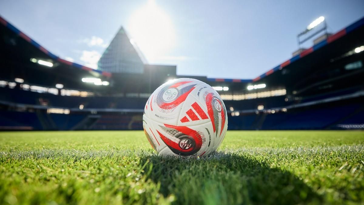 Hoy, adidas presenta el balón oficial para las semifinales y la final de la Eurocopa Femenina 2025. Sobre un fondo nacarado, Konektis presenta patrones en bloques de bordes dentados en rojo y plateado.