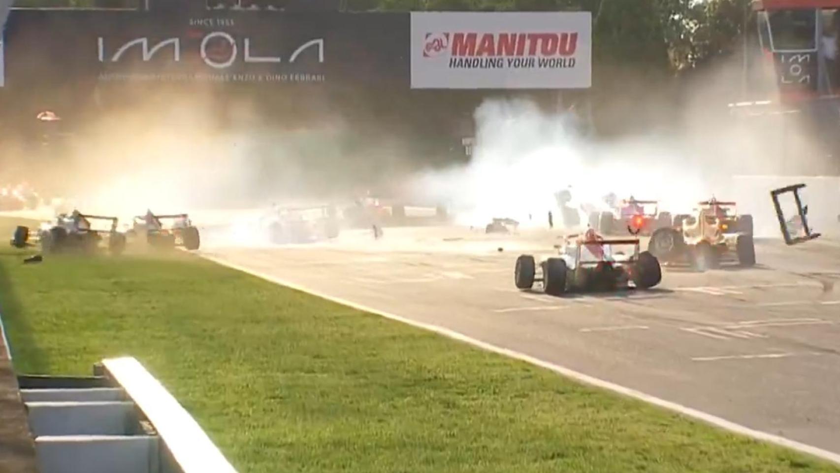 Desde entonces, y a pesar de que los comisarios de pista ondearon las banderas amarillas inmediatamente, comenzó un efecto dominó en el que más de una decena de monoplazas sufrieron daños considerables, dispersos en la recta principal del autódromo Enzo y Dino Ferrari.