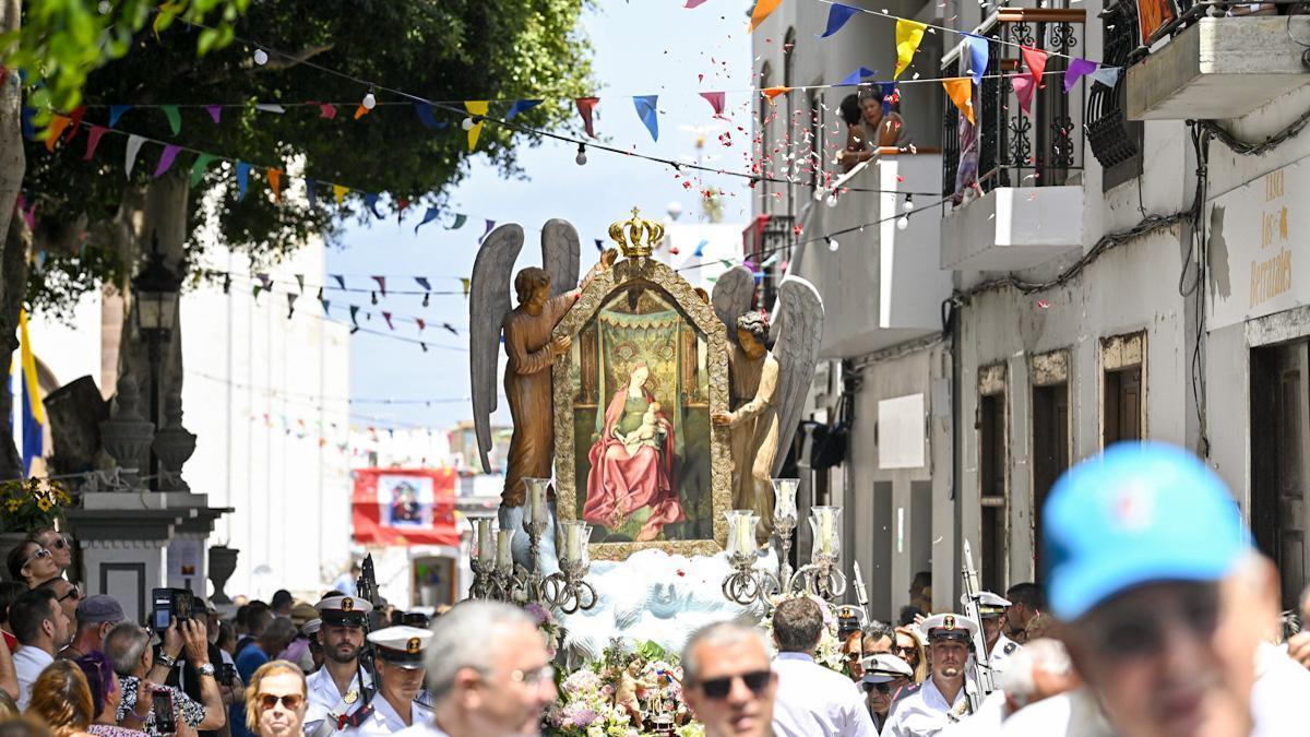 Tras La Rama, Agaete celebró la festividad de la Virgen de Las Nieves con el emotivo Encuentro en el Puente Viejo entre las imágenes de la patrona y de San José. Luego, en las calles del pueblo, la procesión recibió una lluvia de flores para poner punto y seguido hasta la bajada otra vez a la ermita.