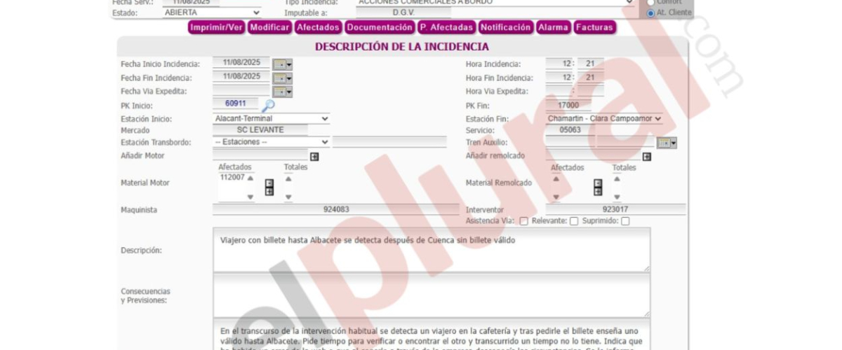 En esa incidencia pone: «En el transcurso de la intervención habitual se detecta un viajero en la cafetería y tras pedirle el billete enseña uno válido hasta Albacete. Pide tiempo para verificar o encontrar el otro y transcurrido un tiempo no lo tiene. Indica que ha habido un error de la web o que al cogerlo a través de la empresa desconocía las circunstancias. Se le informa de que es necesario hacer un billete nuevo para el trayecto restante entre Albacete y Madrid. Se le indica el precio en vigor en ese momento para ese tren y que es necesario tener billete y abonarlo para estar cubierto en caso de accidente. Tras el intercambio de explicaciones entre ambas partes el viajero abona finalmente el billete». Es decir, que no llevaba billete entre Albacete y Madrid, tal y como ha informado con total rigurosidad, y tras contrastar la información por dos fuentes diferentes e independientes entre ellas, este periódico.