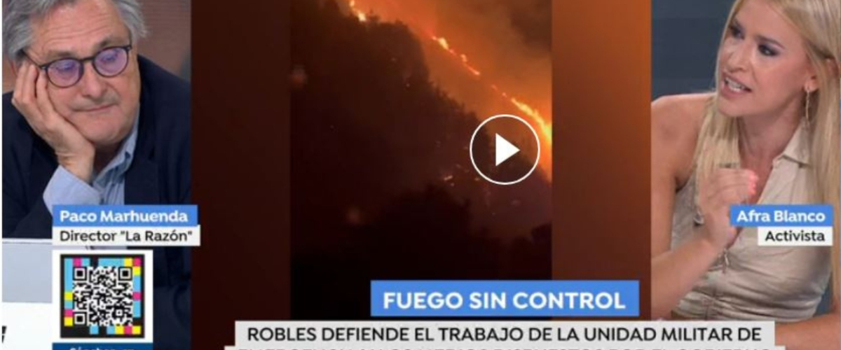 La activista, Afra Blanco, se ha enfrentado al director de La Razón, Francisco Marhuenda, quienes han chocado frontalmente, provocando la necesidad de intervención por parte del moderador, Lorena García. Iniciando con un ataque hacia el presidente del Gobierno, Pedro Sánchez, por no haber regresado de su semana de vacaciones pese a los incendios y ponerse “al orden de lo que quieren las comunidades Autónomas” mientras que la ministra de Defensa, Margarita Robles, sí lo ha hecho, Blanco ha respondido: «Decís que Robles no va a criticar [a políticos] porque es el momento de solventar la emergencia. Ella no lo va a hacer, y me parece oportuno y acertado que no lo haga, pero yo sí que lo voy a hacer, como sindicalista y como hija y nieta de gallegos».