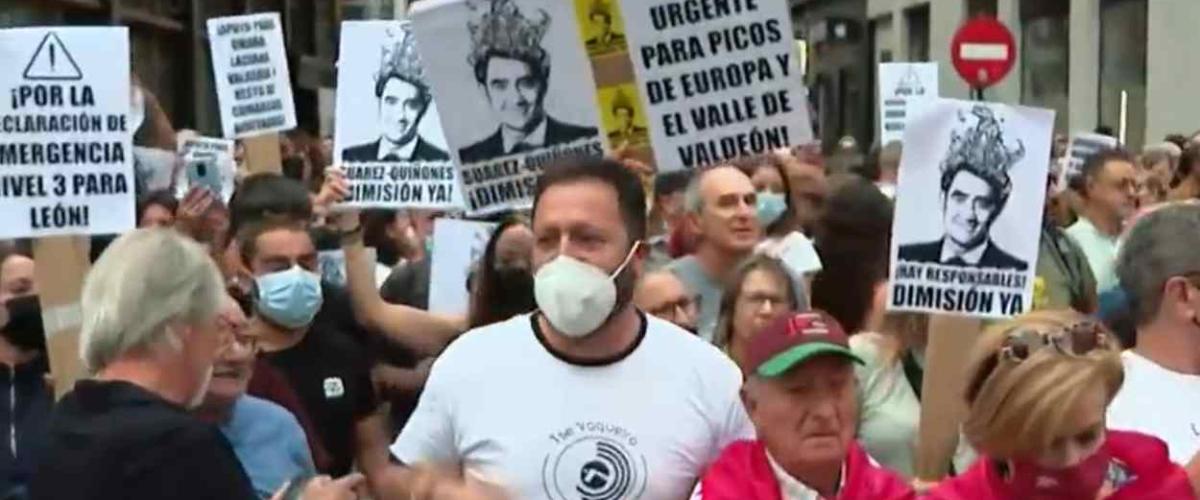 León capital ha acogido este lunes desde las 20:00 horas una concentración para exigir la dimisión de Alfonso Fernández Mañueco, presidente de la Junta de Castilla y León, y de Juan Carlos Suárez-Quiñones, consejero de Medio Ambiente, Vivienda y Ordenación del Territorio, ante la falta de prevención y medios para abordar la oleada de incendios que azota a la comunidad, especialmente a León, pero también a otras provincias como Zamora, Palencia o Ávila.