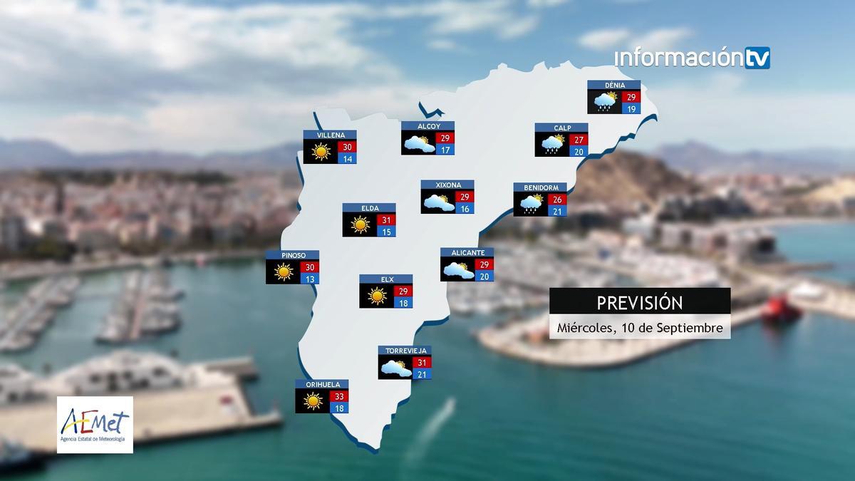La provincia de Alicante vivirá este jueves 11 de septiembre una jornada con cielo poco nuboso o despejado y temperaturas en ascenso que pueden llegar a los 35ºC en localidades como Elche u Orihuela.