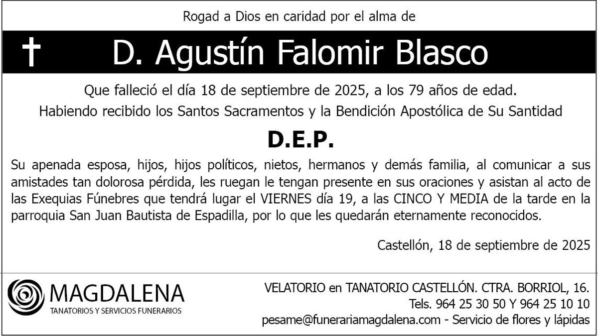 Inicio Negocio D. Agustín Falomir Blasco Negocio D. Agustín Falomir Blasco Por Elena Castro - septiembre 18, 2025 35 0 FacebookTwitterPinterestWhatsApp D. Agustín Falomir Blasco Fuente Artículos relacionadosMás del autor Borja Jiménez empieza a definir el nuevo Sporting Sánchez esgrime contra Ayuso la carta de Feijóo sobre el aborto FELIPE VI ACUERDO GAZA ISRAEL No lo hagas. Compra casas que te den ingresos todos los... octubre 9, 2025 SUCESOS CANARIAS | Muere un joven tras causar un fuego en... octubre 9, 2025 La UCO detecta pagos de Koldo para viajes de tren vinculados... octubre 9, 2025 PSICÓLOGOS CENTROS DE SALUD MALLORCA octubre 9, 2025 La Federació Catalana de Vela rebutja el cessament d’activitat del Club... octubre 9, 2025 San Patricio Lorca | Retiran la vegetación que había crecido en... octubre 9, 2025 Borja Jiménez empieza a definir el nuevo Sporting octubre 9, 2025 Un filme extraordinario sobre el peligro nuclear octubre 9, 2025 UEFA confirma la negociación con A22, la promotora de la Superliga,... octubre 9, 2025 Las salidas de vía son el causante de más del 40%... octubre 9, 2025 Cuenta atrás para Fermín octubre 9, 2025 ¿Oro en Guadalajara? Una empresa lo busca en la Sierra Norte... octubre 9, 2025 PEZ LONGEVIDAD | Este es el pez que puede tener el... octubre 9, 2025 PEZ LONGEVIDAD | Este es el pez que puede tener el... octubre 9, 2025 PEZ LONGEVIDAD | Este es el pez que puede tener el... octubre 9, 2025 Político12918Deportes8341Mundo7092Nacional6711International5982Noticias5733Negocio5184