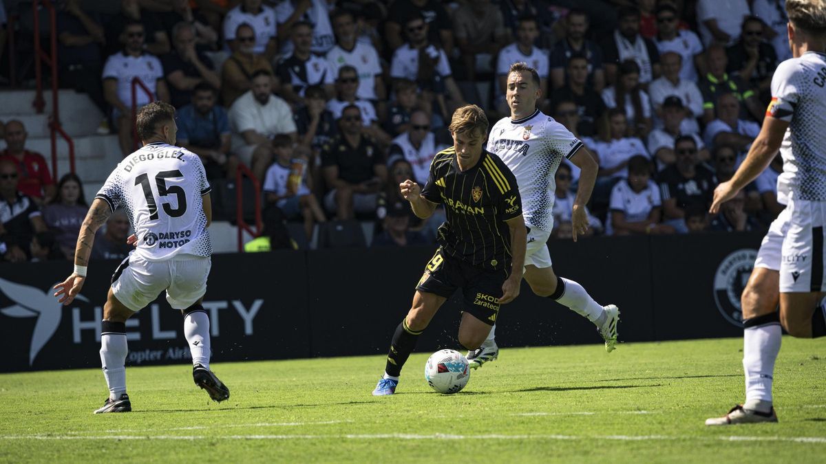 El Ceuta, con la medular más poblada en ese 4-3-3, pudo marcar en una buena acción de Rubén Díez con el remate de Zalazar que despejó Adrián y que Almenara mandó al larguero. El Zaragoza era un dolor absoluto, con Juan Sebastián, ya con amarilla, sufriendo con Koné y con un disparo del extremo que despejó Adrián. En medio de la nada que fue el Zaragoza, una contra de Sebas Moyano, activo y generador de amarillas en el rival, acabó en Dani Gómez y en una falta al borde del área que Moyano mandó fuera por poco.