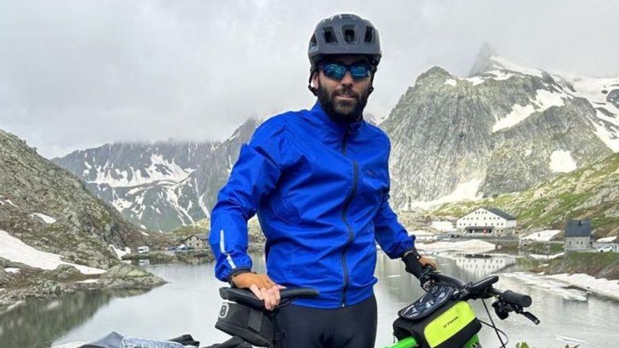 El filólogo y escritor Pepe Pérez-Muelas, con su bici en los Alpes.
