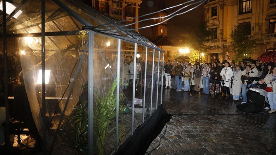En la plaza de Porlier, en pleno casco antiguo, un cristal separaba y conectaba al espectador con la música. En el interior de una estructura que simulaba un invernadero, un piano de cola llamaba la atención del público que se desplazaba por las calles de Oviedo para sumergirse en las variadas propuestas de la Noche Blanca.