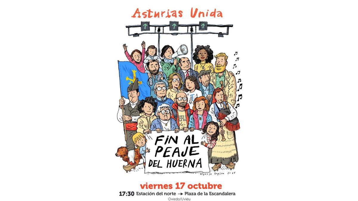 La imagen refuerza aún más el eslogan escogido por el organismo para la marcha: «Asturias unida. Fin al peaje del Huerna». La movilización, abierta a toda la ciudadanía, partirá a las 17.30 horas de la Estación del Norte y culminará en la plaza de la Escandalera, donde se procederá a la lectura del manifiesto consensuado por las 25 organizaciones sociales, políticas y económicas que, junto al Gobierno de Asturias, forman parte de la Alianza.