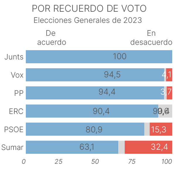 También los votantes de Junts y ERC son muy partidarios de iniciativas como esta, aunque el número de encuestados es más pequeño en el caso de estos partidos como para sacar grandes conclusiones. El 100% de los posconvergentes preguntados respondieron afirmativamente a la pregunta, mientras que también lo hicieron el 90,4% de los republicanos.