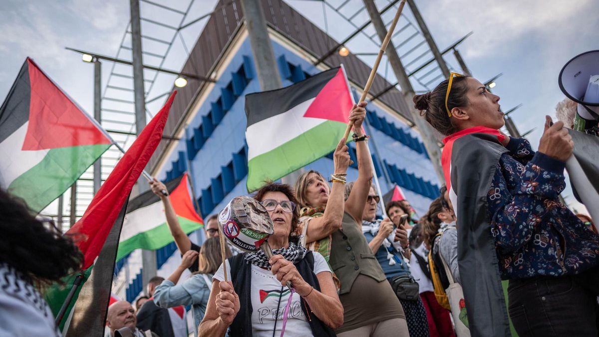 Decenas de personas se reúnen a las afueras del Santiago Martín antes del partido a puerta cerrada entre el Club Baloncesto Canarias y el Bnei Herzliya.