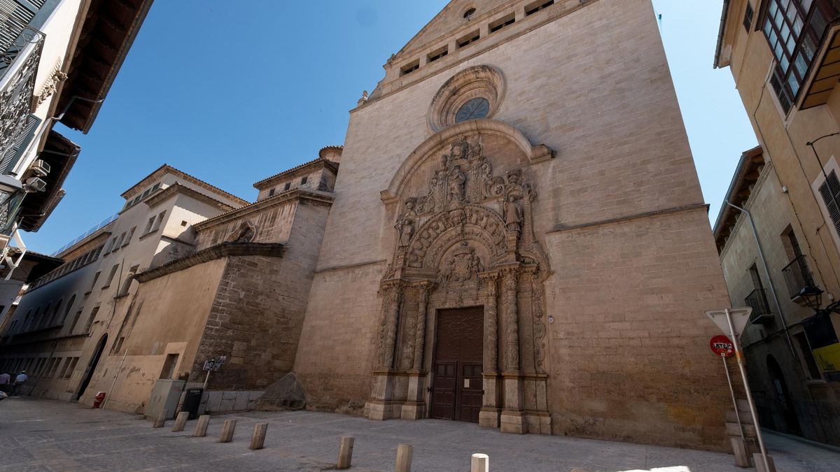 Fachada de Montesión desde la calle San Alonso, con una tela azul para evitar desprendimientos / Miguel Vicens