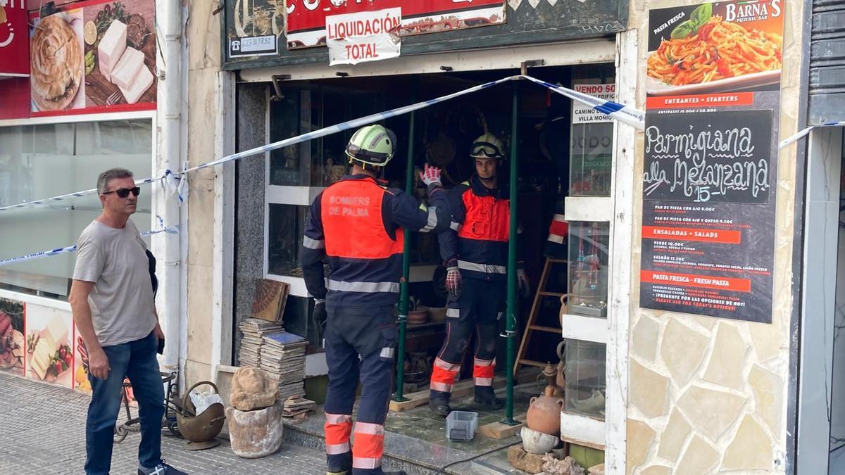 Juan Antonio Ibáñez se encarga desde hace unos meses del negocio de antigüedades de la barriada de Cala Major que esta mañana ha quedado precintado por peligro de derrumbe. Ha sido él quien ha avisado a los bomberos, porque la dueña del negocio, que lleva 40 años abierto al público, está ingresado desde hace unos meses en un hospital. “Ayer me encontré un trozo de yeso en el suelo y ya empecé a preocuparme. Pero esta mañana he visto que la viga principal, que atraviesa el local de lado a lado, estaba partida y el techo empezaba a agrietarse”. Ante este descubrimiento lo primero que ha hecho ha sido avisar a los bomberos, que ante el peligro de derrumbe, además de precintar los seis locales del edificio, han apuntalado el techo del local para evitar el derrumbe. “Nos hemos salvado de milagro porque una viga partida es muy peligrosa. Podría haber ocurrido lo mismo que pasó en el local del Arenal, donde el techo se vino abajo al partirse la viga de sujeción. Menos mal que me he dado cuenta del peligro cuando no había nadie en la tienda. Hemos evitado una gran desgracia”.
