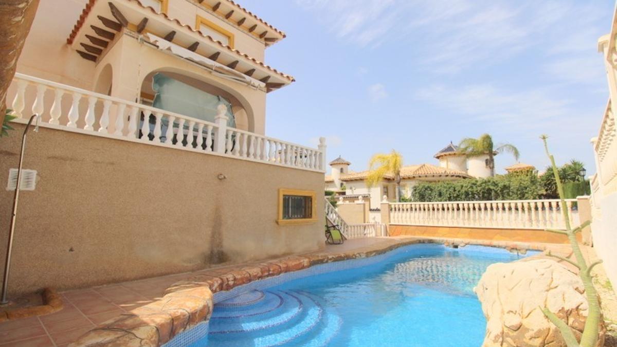 En el portal inmobiliario Tucasa.com hay a la venta una casa con piscina privada, situada en La Zenia, Orihuela Costa. La villa está formada por dos viviendas independientes: la vivienda principal dispone de 3 dormitorios, baño y aseo y en el sótano cuenta con un apartamento de un dormitorio con un baño, cocina y zona de estar, perfecto como casa de invitados.