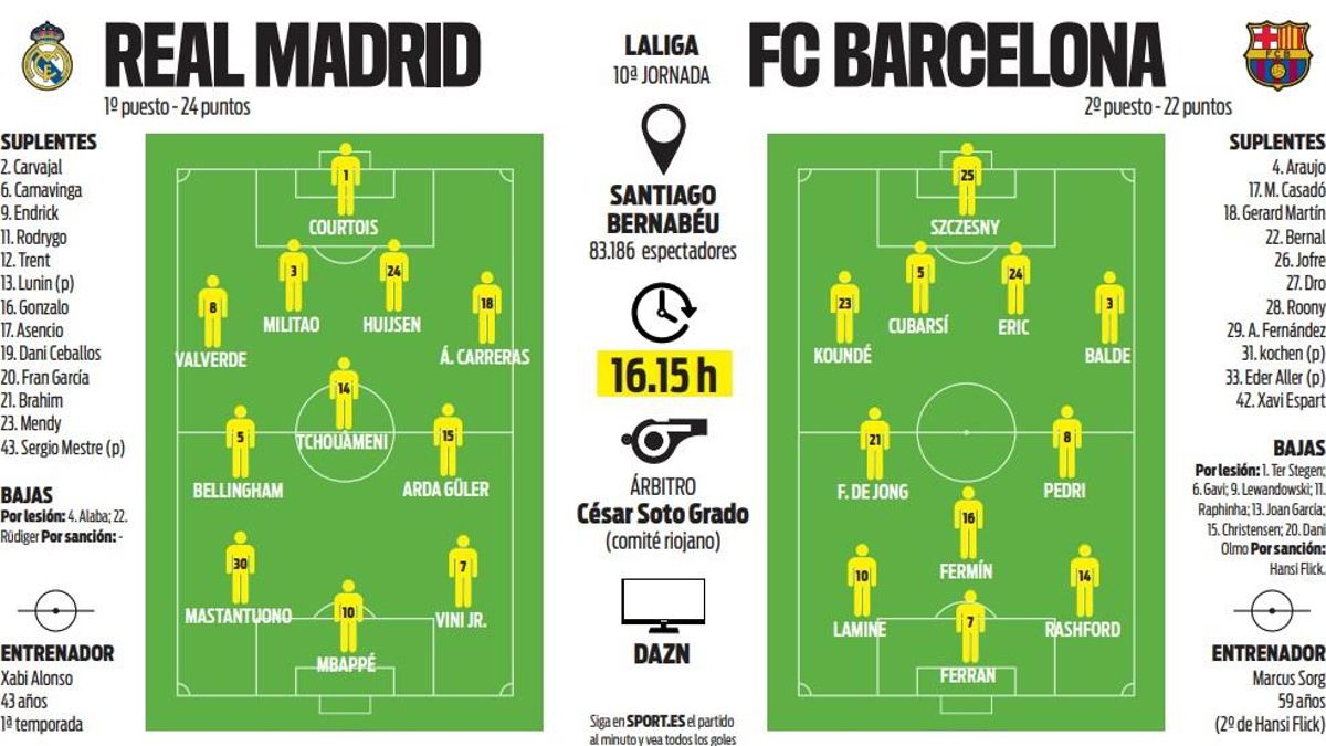 En esa relación de nombres apareció un Ferran Torres que regresa de lesión (ya entró en la lista para Olympiacos, pero no jugó ni un minuto) y que está listo para El Clásico. El de Foios no ha participado en los dos últimos compromisos oficiales del Barça tras lesionarse con España. Sorg comentó en rueda de prensa que decidirían las horas previas al encuentro si salía o no de inicio, pero todo indica que, ante las bajas de Lewy y Raphinha, estará en la punta de lanza. Acompañado por Lamine Yamal y Marcus Rashford.