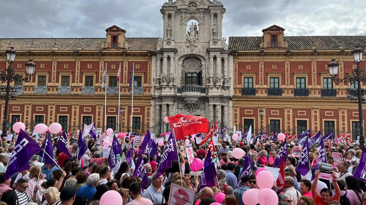 No cabe nadie en la explanada frente al Palacio de San Telmo. Una marea rosa, formada por alrededor de 30.000 personas y encabezadas por mujeres ha tomado este domingo el centro de Sevilla para reclamar soluciones ante la crisis sanitaria desatada tope las incidencias y los retrasos en los cribados del cáncer de mama en Andalucía.