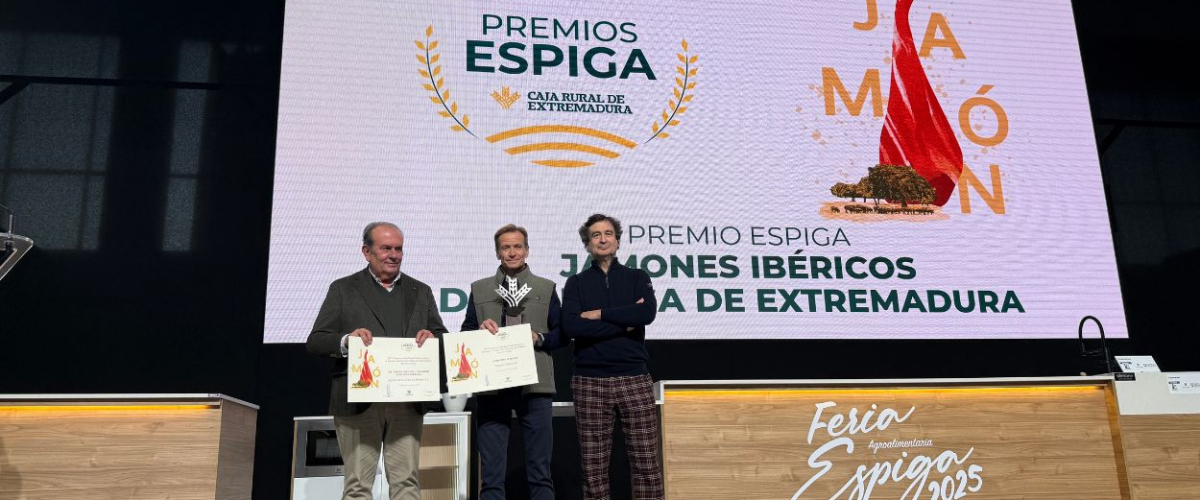 La ceremonia, celebrada en el marco de la II Feria Agroalimentaria Espiga, impulsada por Caja Rural Extremadura, sirvió también para otorgar los tradicionales reconocimientos a los mejores jamones ibéricos amparados por la DOP. El Espiga de Oro fue para Embutidos Morato, de Los Santos de Maimona, junto al ganadero Santiago Pérez; el Espiga de Plata recayó en Jamón y Salud, de Llerena, y en la ganadera Ana Isabel Aceituno Reboto; y el Espiga de Bronce fue para Embutidos Mota, de Cabeza la Vaca, y el ganadero Juan Luis Medina Casquete.