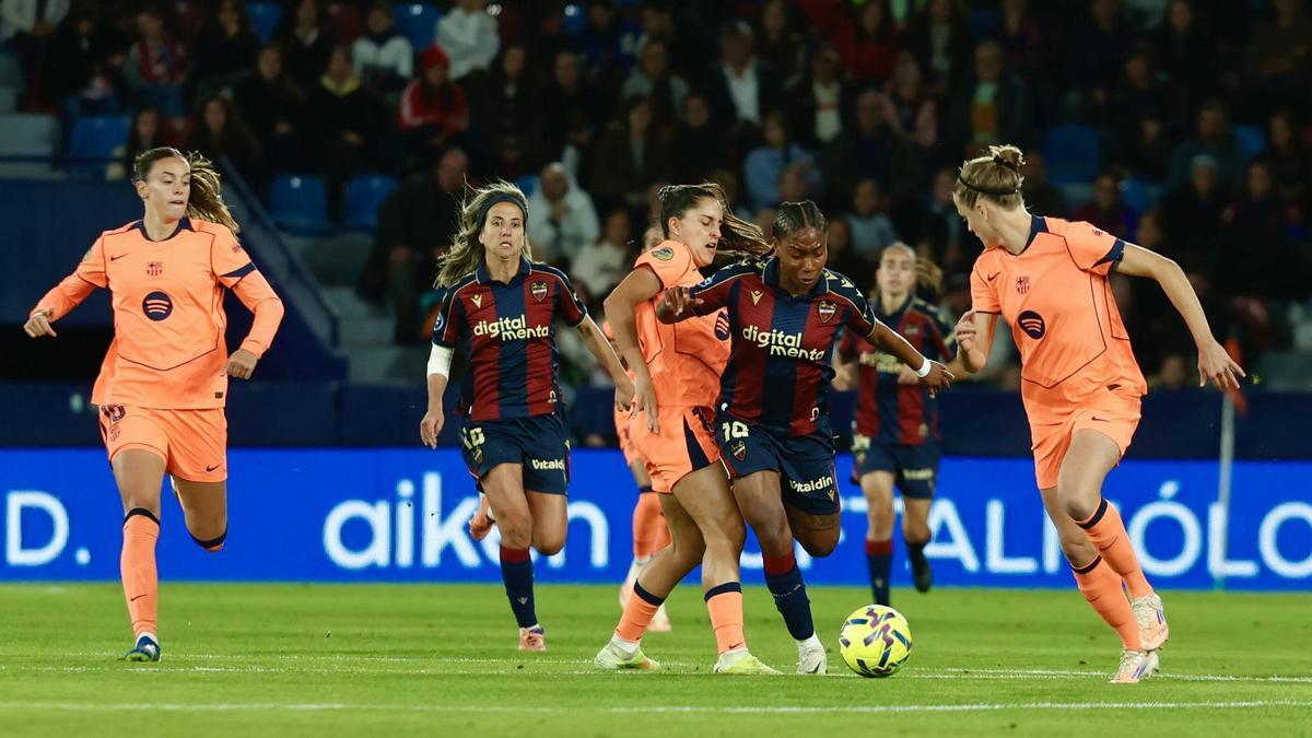 Pese al tanto encajado, la defensa volvió a ser lo más brillante del Levante. Eva Alonso, Le Guilly, Tere Mérida y Alma Velasco achicaron tanto balones como pudieron. Cuando la ocasión lo demandaba, Sintia Cabezas, que firmó su mejor partido como levantinista, ayudaba en tareas defensivas. Cinco minutos tuvieron de respiro las granotas. Nada más. El monólogo del Barça se intensificó tras el paso por vestuarios. Kika Nazareth se encontró con el premio del gol que ya rondó en la primera mitad; Claudia Pina se rehízo de su fallo desde los once metros, precisamente, en ese mismo punto y; también desde la pena máxima, Alexia Putellas cumplió la ley del ex.