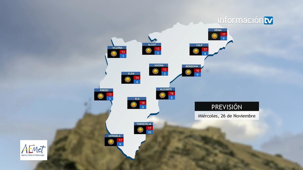 La provincia de Alicante amanece este miércoles con ambiente frío, según la Agencia Estatal de Meteorología (AEMET), con mínimas en torno a los 4-10 grados y máximas entre los 12 y los 18 ºC. En general, el ambiente será estable, seco y muy luminoso en buena parte de las comarcas. Si bien no hay aviso de precipitaciones, las fuertes rachas de viento de componente norte y noroeste se hará notar especialmente en Dénia, donde podrán alcanzar los 70km/h. El viento también se hará notar en Alicante, Benidorm, Elda o Alcoy, donde alcanzará rachas de 50 km/h y acentuará la sensación de frío.