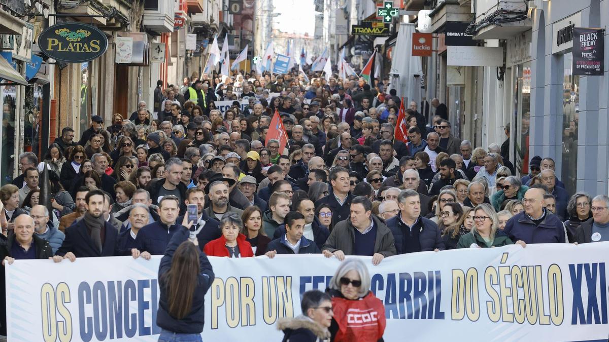 Una multitudinaria manifestación en Ferrol cerró filas en el mediodía de este domingo en torno a la reivindicación de un servicio ferroviario «digno», ante lo que la sociedad civil y política considera una «discriminación» de las comarcas de Ferrolterra, Eume y Ortegal en las políticas de modernización del transporte.
