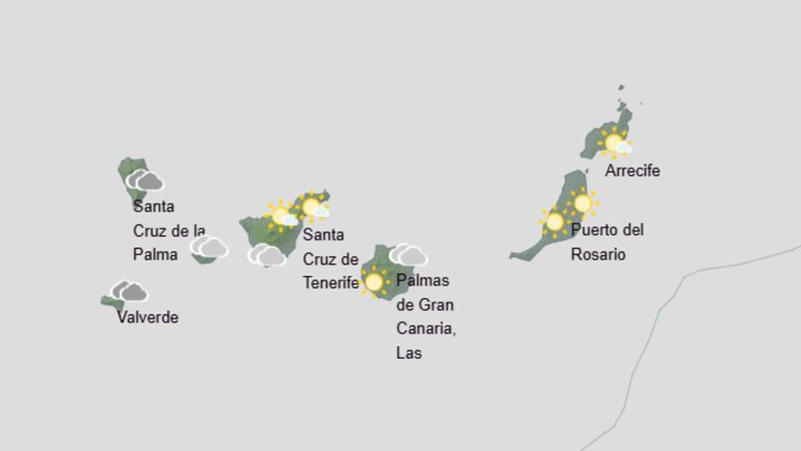 Nuboso en el norte y este con probables precipitaciones débiles y ocasionales durante la primera mitad del día. En el resto de zonas, intervalos de nubosidad alta con algunos intervalos de bajas en el oeste durante la tarde. Temperaturas sin cambios, salvo ligero ascenso de las máximas en cumbres y medianías. Viento moderado del nordeste con intervalos de fuerte en la zona de El Paso y en extremos sureste y noroeste, donde no se descartan rachas muy fuertes, especialmente durante la madrugada y primeras horas. Predominio de las brisas en costas del oeste.