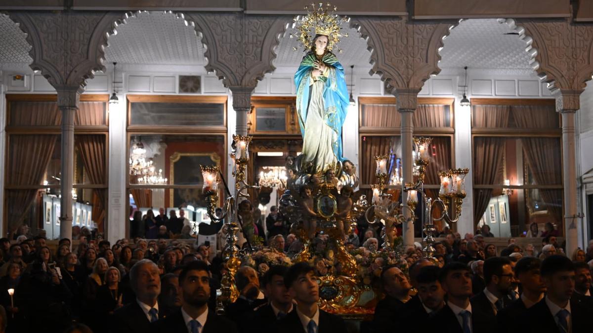La talla de La Purísima lució la aureola de su coronación canónica restaurada, delicado trabajo realizado en los talleres de Olmo Quirón de Rota, en Cádiz. Además, los Hijos de la Inmaculada estrenaron la restauración de su estandarte principal llevado a cabo en los talleres de la bordadora María Teresa Pamies, de Crevillent.