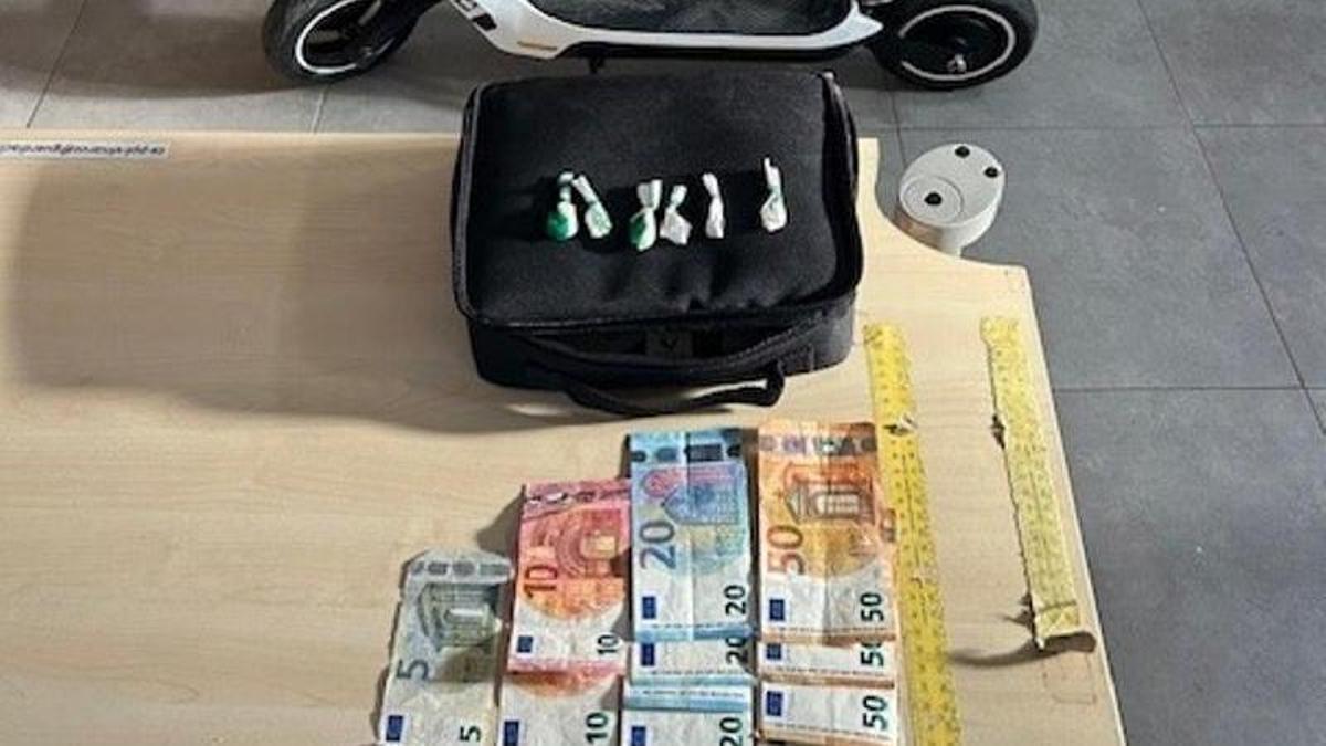 Durante este dispositivo, los agentes observaron a una persona que circulaba en un patinete eléctrico sin las luces, motivo por el que procedieron a darle el alto y efectuar su identificación. Al mismo le encontraron seis papelinas de cocaína, con un peso aproximado de seis gramos, así como 355 euros en metálico, distribuidos en billetes de distinto valor.