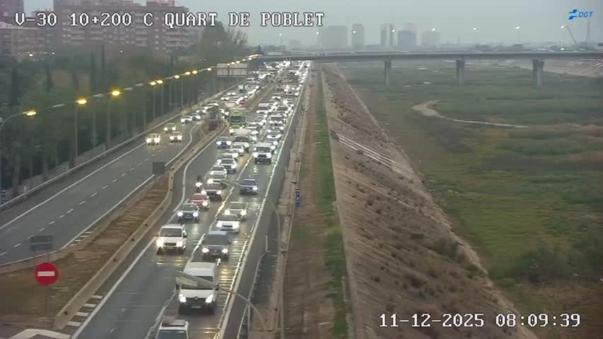 En dirección hacia el puerto, la V-30 también está congestionada durante tres kilómetros entre Quart de Poblet y el Barrio de la Luz, así como dos más entre Castellar y Pinedo.