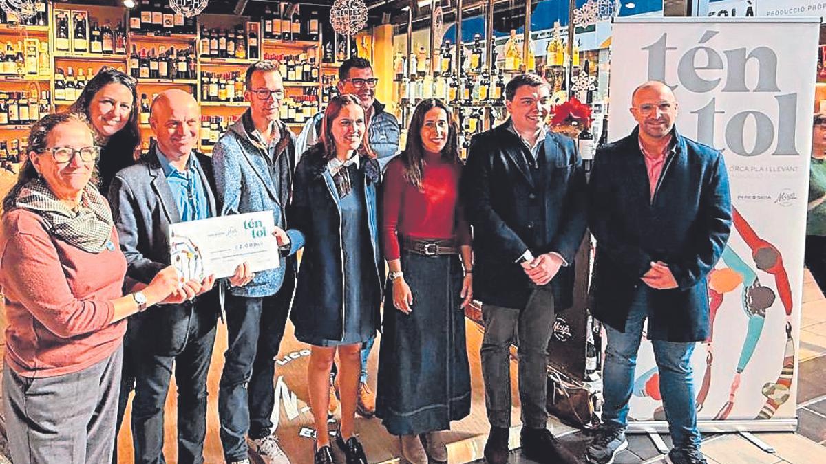 El vino Téntol, creado por Licors Moyà con la colaboración de Bodegas Pere Seda, se presentó ayer en la vinoteca de la licorería en el mercado del Olivar. Un porcentaje de las ganancias por su venta se destinará en esta tercera edición solidaria a la Associació Balear d’Esclerosi Lateral Amiotròfica (ELA), que recibió un adelanto.