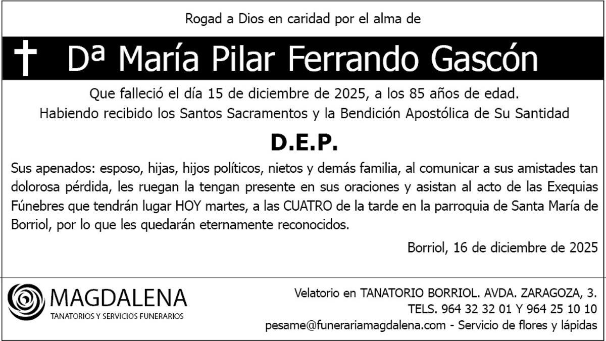 Inicio Negocio Dª María Pilar Ferrando Gascón Negocio Dª María Pilar Ferrando Gascón Por Elena Castro - diciembre 15, 2025 35 0 FacebookTwitterPinterestWhatsApp Dª María Pilar Ferrando Gascón Fuente Artículos relacionadosMás del autor TIEMPO PENÍSCOLA/PEÑÍSCOLA | El tiempo en Peníscola/Peñíscola: previsión meteorológica para hoy, sábado 7 de marzo TIEMPO CABANA DE BERGANTIÑOS | El tiempo en Cabana de Bergantiños: previsión meteorológica para hoy, sábado 7 de marzo PULSERAS ANTIMALTRATO | Igualdad sanciona a Vodafone con 25.000 euros por el fallo de las pulseras antimaltrato en noviembre El liderazgo femenino en tecnología, educación y comunicación impulsa cambios en... marzo 7, 2026 El ‘no’ de Vox a María Guardiola en Extremadura anticipa unas... marzo 7, 2026 TIEMPO PENÍSCOLA/PEÑÍSCOLA | El tiempo en Peníscola/Peñíscola: previsión meteorológica para hoy,... marzo 7, 2026 TIEMPO SANT LLUÍS | El tiempo en Sant Lluís: previsión meteorológica... marzo 7, 2026 La jornada 27 de LaLiga EA Sports, en imágenes marzo 7, 2026 TIEMPO MURCIA | El tiempo en Murcia: previsión meteorológica para hoy,... marzo 7, 2026 TIEMPO ORTIGUEIRA | El tiempo en Ortigueira: previsión meteorológica para hoy,... marzo 7, 2026 TIEMPO ALICANTE/ALACANT | El tiempo en Alicante/Alacant: previsión meteorológica para hoy,... marzo 7, 2026 Sporting de Gijón: En los orígenes de Duba, el pichichi que... marzo 7, 2026 El Dow cierra su peor semana en casi un año en... marzo 7, 2026 Disfruta del coloquio sobre «Cleopatra» de Joseph L. Mankiewicz en ‘Classics,... marzo 7, 2026 TIEMPO BETANCURIA | El tiempo en Betancuria: previsión meteorológica para hoy,... marzo 7, 2026 TIEMPO CABANA DE BERGANTIÑOS | El tiempo en Cabana de Bergantiños:... marzo 7, 2026 el rodaje en Tenerife que esconde una historia inesperada marzo 7, 2026 TIEMPO BENAVENTE | El tiempo en Benavente: previsión meteorológica para hoy,... marzo 7, 2026 Político23047Deportes14797Mundo12698Nacional11905International10611Noticias10264Negocio9281