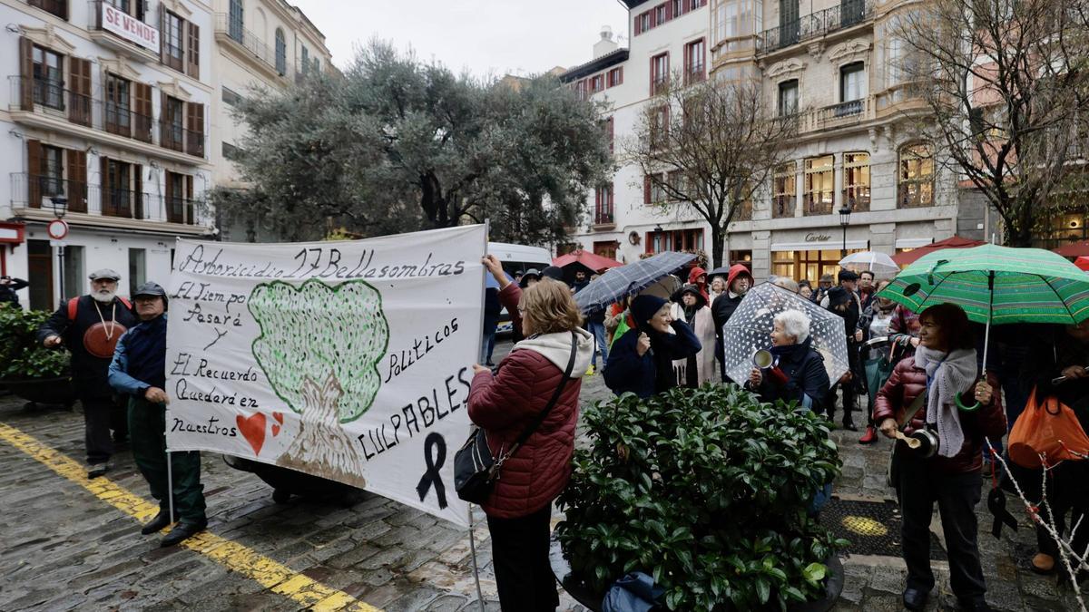 Pese al frío y la lluvia, una treintena de personas han acudido esta mañana a la plaza de Cort con sus cacerolas para protagonizar una sonora protesta contra la tala de los diecisiete bellasombras que quedaban en la plaza Llorenç Villalonga. Una polémica intervención que el Ayuntamiento de Palma ejecutó el pasado jueves y que ha justificado por el «riesgo de caída» que presentaban los árboles.