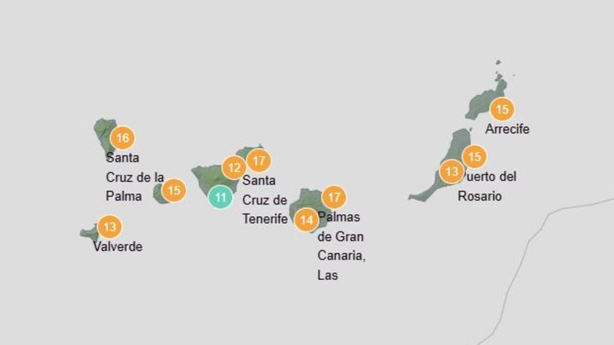 La máxima llegará a 21 grados en Santa Cruz de Tenerife y a 20 en Las Palmas de Gran Canaria y la mínima será de 16 grados en ambas capitales, de acuerdo a su pronóstico, que señala que el viento se espera moderado del nordeste, con intervalos fuertes y rachas puntualmente muy fuertes.