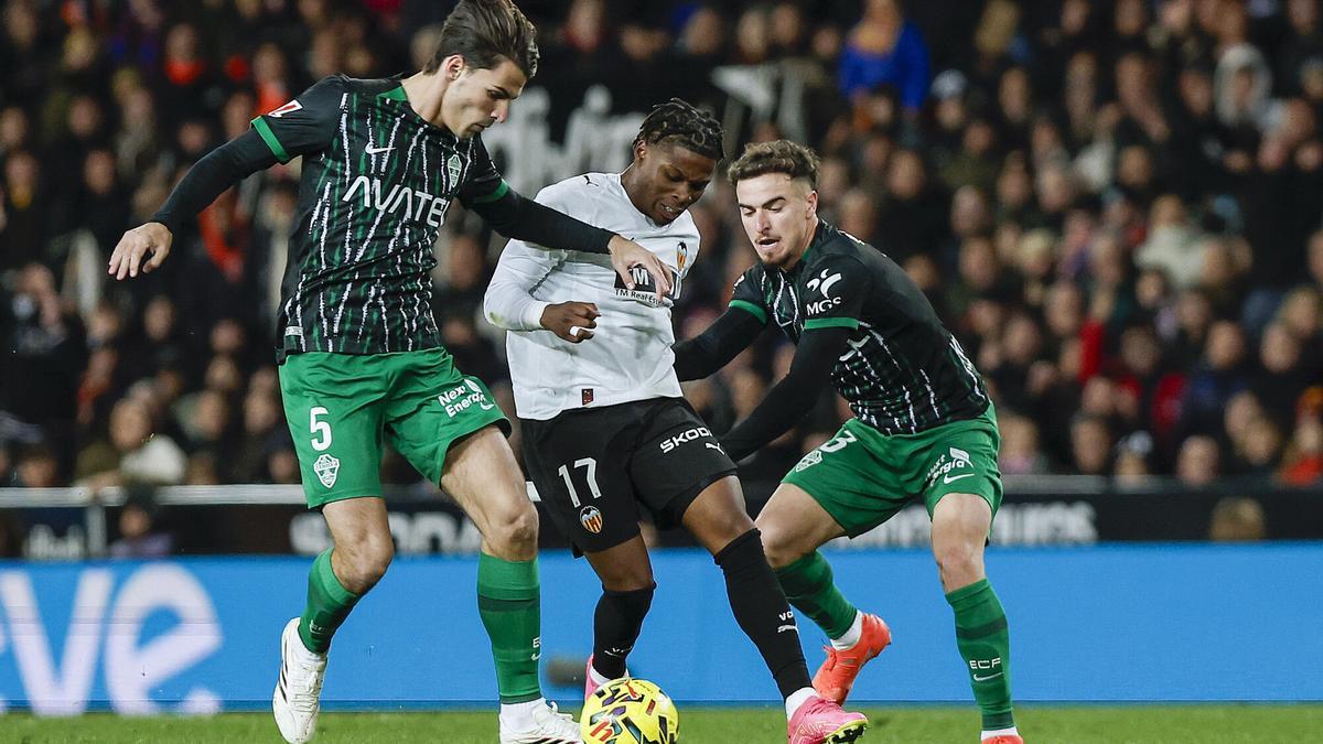 No le salió mal. En los primeros quince minutos ya había creado dos ocasiones claras de peligro, pero Luis Rioja las desperdició. El equipo de Carlos Corberán logró tener la posesión frente a un rival que la acapara toda, aunque no estaba acertado y entre error y error, el Valencia perdió a Thierry por lesión. Mientras, el Elche no tenía prisa ni en sacar de puerta ni en atacar.