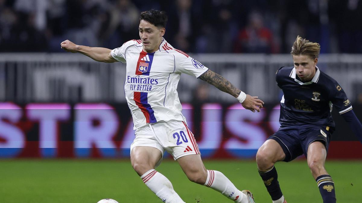 LYON (France), 11/12/2025.- Martin Satriano (L) of Lyon in action against Giovanni Van Zwam of Go Ahead Eagles during the UEFA Europa League league phase match between Olympique Lyonnais and Go Ahead Eagles, in Lyon, France, 11 December 2025. (Francia) EFE/EPA/GUILLAUME HORCAJUELO / GUILLAUME HORCAJUELO