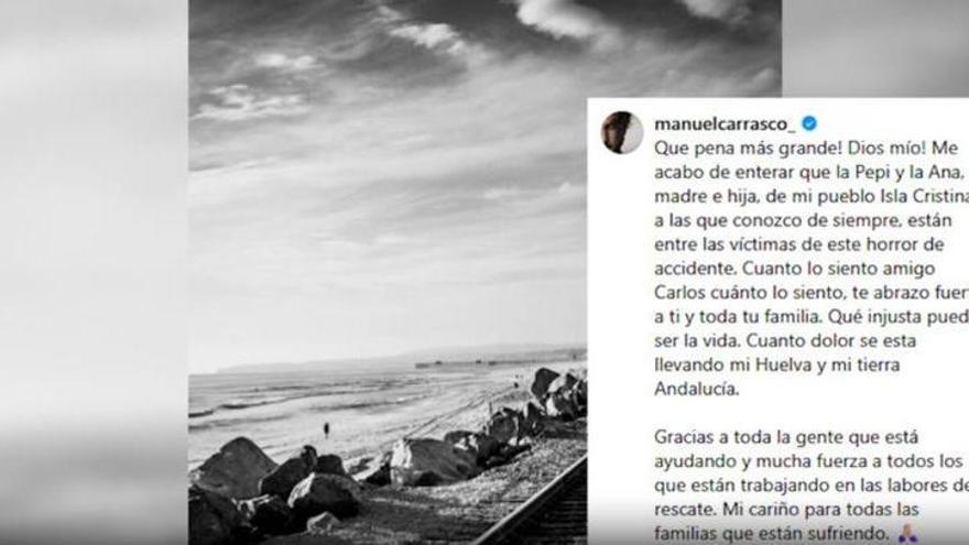 Todo el país continúa conmocionado por el trágico accidente ferroviario ocurrido el domingo por la tarde en Adamuz (Córdoba), en el que dos trenes colisionaron y que, por el momento, ha dejado al menos 41 víctimas mortales. Entre quienes lloran esta irreparable pérdida se encuentra el cantante Manuel Carrasco, quien ha lamentado la muerte de dos mujeres de su localidad natal, Isla Cristina (Huelva), a las que, según ha confesado a través de Instagram, conocía desde siempre.