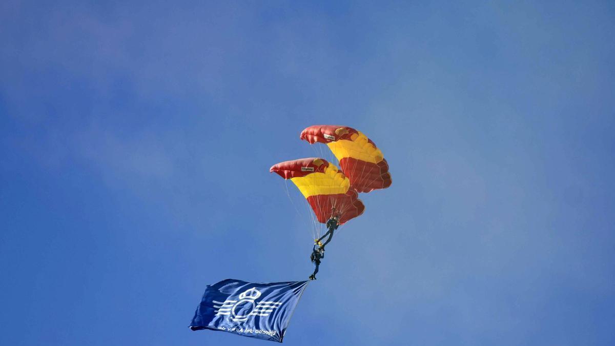 Tras rendir tributo a quienes dieron su vida por España, acabó el acto castrense propiamente dicho y los presentes pudieron buscar el mejor sitio para empezar a mirar al cielo, porque empezaba la exhibición paracaidista. Y decenas de paracaidistas inundaron el cielo.