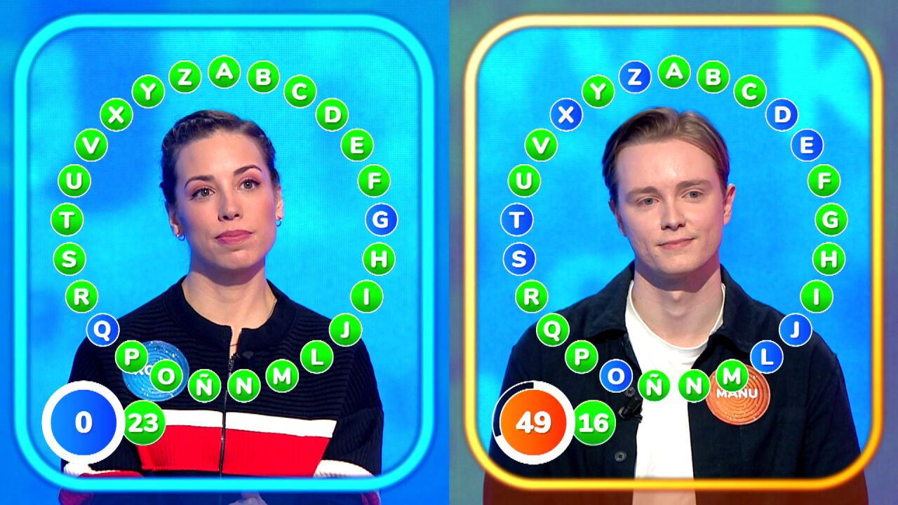 Manu ha conseguido llegar a El Rosco con una de sus mejores marcas de segundos. Ha empezado con 158 y ha desarrollado una táctica acorde a esa tranquilidad. Lo demuestra su marcador al terminar la primera vuelta: 16 aciertos. Rosa, también prudente e intentado no tropezar, la ha completado con 19 letras en verde, sumando una más en esa misma jugada.