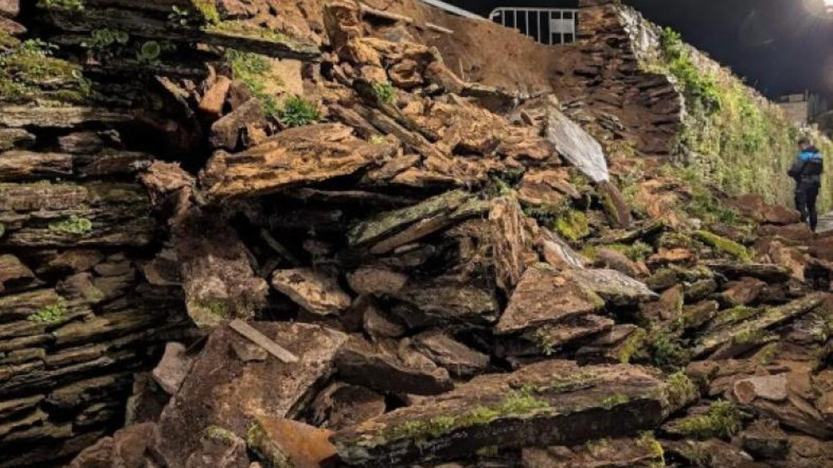 Una parte del lienzo interior de la Muralla de Lugo, situado en la rúa do Moucho -próxima a la Catedral- se derrumbó en la noche de este sábado sin causar daños personales. Este episodio ha sucedido en el marco de las lluvias persistentes de estos días, aunque fuentes oficiales todavía no han confirmado su causa.