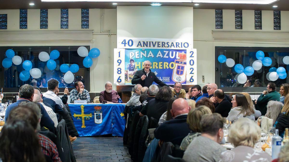 La Peña Azul Herrero, una de las que atesora más tradición en el oviedismo, está de celebración. Ayer festejó en un multitudinario acto su 40.º cumpleaños. lo que le convierte en una de las más longevas dentro del oviedismo. La celebración tuvo lugar en el Llagar de Quelo, en Tiñana y, como se puede apreciar en la imagen, acudió muchos peñistas además de varios invitados, que comentaron la actualidad azul en un día marcado por la suspensión del choque de Vallecas.. En total más de 100 asistentes al acto para celebrar la salud de la Peña Herrero.