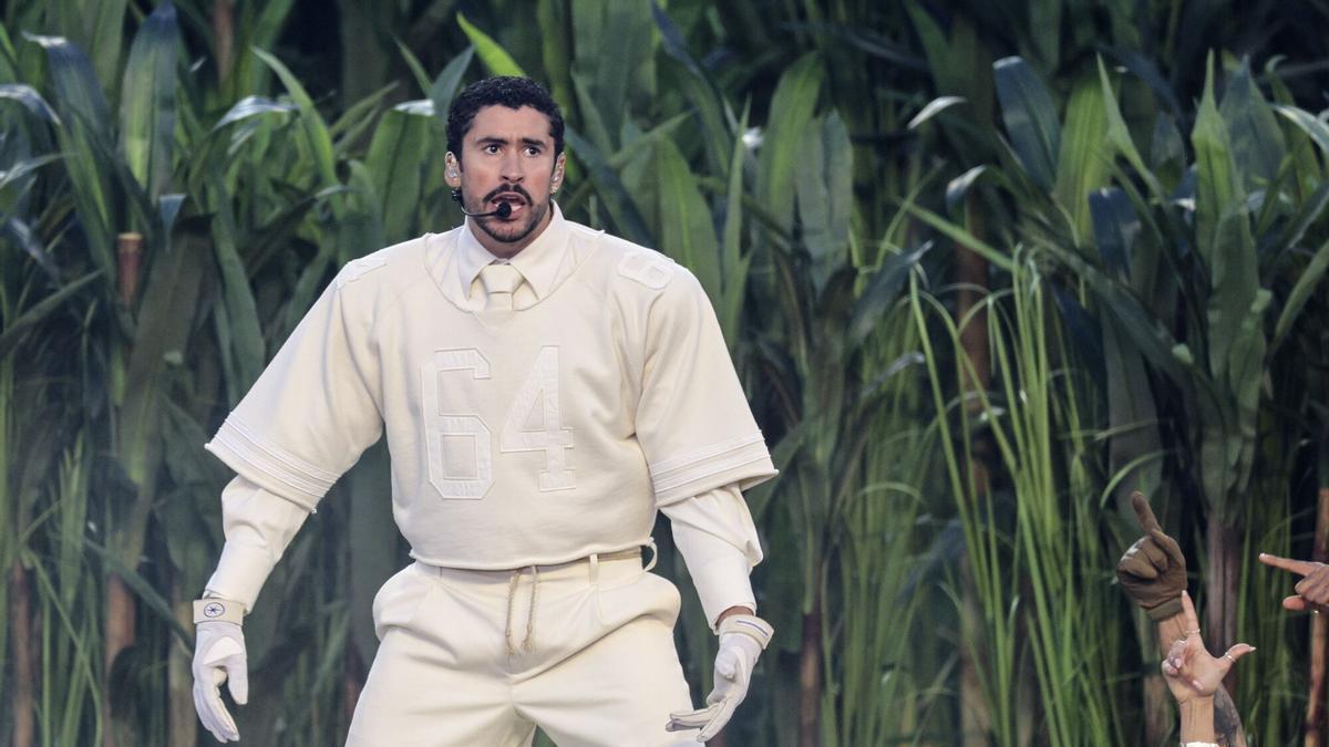 Prendas cuyos precios oscilan este martes entre los 490 y los 30.000 euros, son todas de la talla L y tienen el dorsal 64 que lució Benito Martínez Ocasio durante la espectacular actuación. Llevaba un conjunto de dos piezas monocromáticas de camisa con cuello y corbata y al estilo de jugador de fútbol americano, con pantalones y zapatillas Adidas.