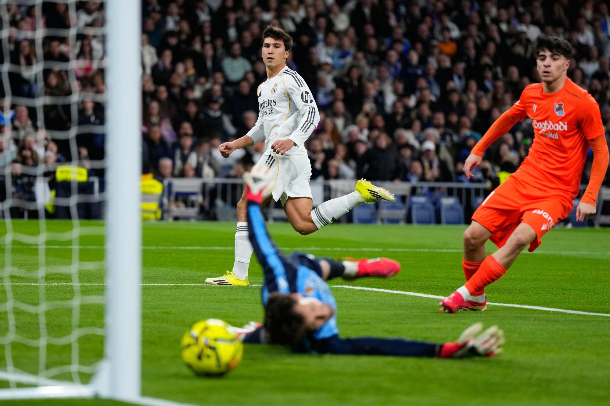 A los cuatro minutos justificó su titularidad el inglés con una comba que Gonzalo remató de primeras para batir a Remiro. El canterano ‘celebró’ la suplencia de Mbappé (0 goles junto a él y 11 sin el galo). Jugaba la Real sin complejos, pero la ventaja del Madrid dio más cuajo al juego local. Pases de seguridad y poco riesgo. Pero como los blancos siguen sin morder sin balón, en el minuto 20 Soler pudo filtrar un pase a Herrera que terminaba con un penalti ingenuo de Huijsen, quien necesita visitar el sofá de Arbeloa o el diván de De la Fuente, tanto da. Oyarzabal empataba pegándole duro al medio y alto. Otro error penalizaba a los de Arbeloa.