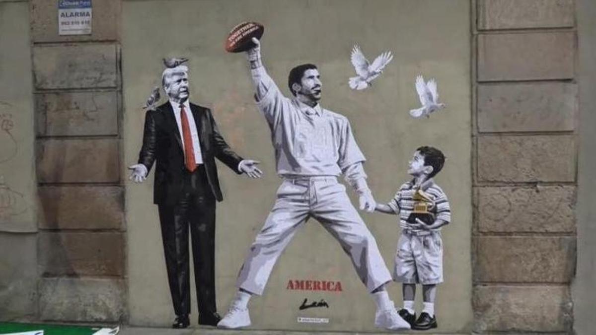 Un grafiti del artista Alberto León en el centro de Barcelona reivindica la paz frente al presidente estadounidense Donad Trump, con una imagen del cantante puertorriqueño Bad Bunny en su espectáculo de la Super Bowl, de la mano de Liam Conejo Ramos, el niño de 5 años detenido en Mineápolis por el Servicio de Control de Migración y Aduanas (ICE).
