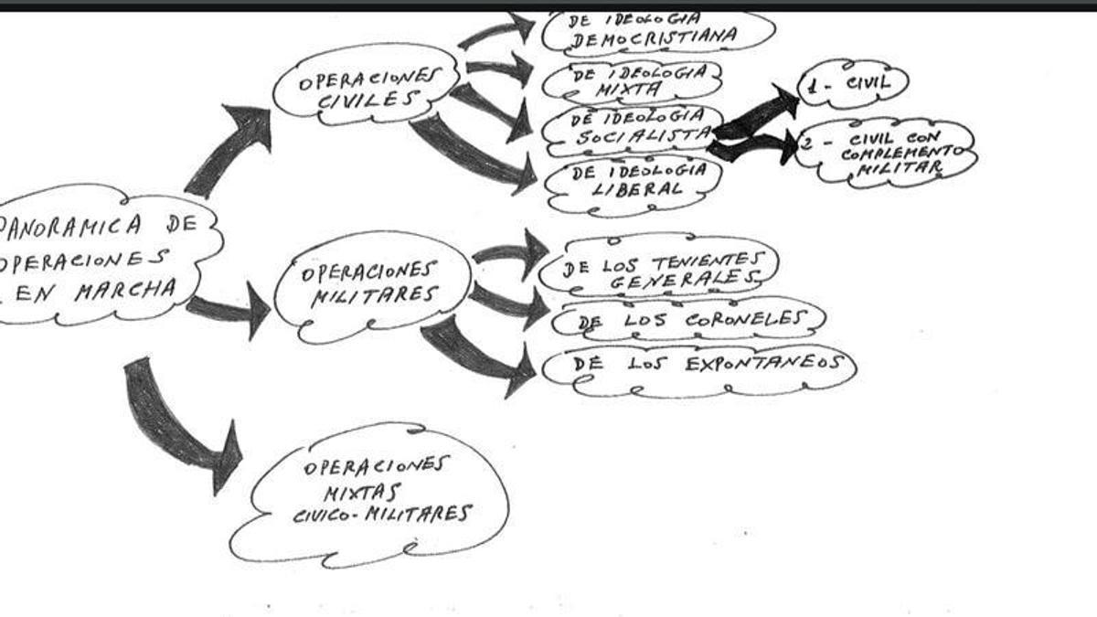 Un documento incautado por la Guardia Civil y desclasificado este miércoles demuestra que la trama que urdió el golpe de Estado del 23-F trabajó a la vez en una decena de escenarios distintos para acabar con el Gobierno de Adolfo Suárez. El texto, fechado en noviembre de 1980, dos meses antes de la asonada, muestra un esquema bajo el título «Panorámica de Operaciones en marcha» en el que se recogen todos los planes, los que seguían la vía militar, la civil o aquellos de naturaleza mixta. Además, se detalla quién ocuparía la presidencia del Gobierno en cada situación.
