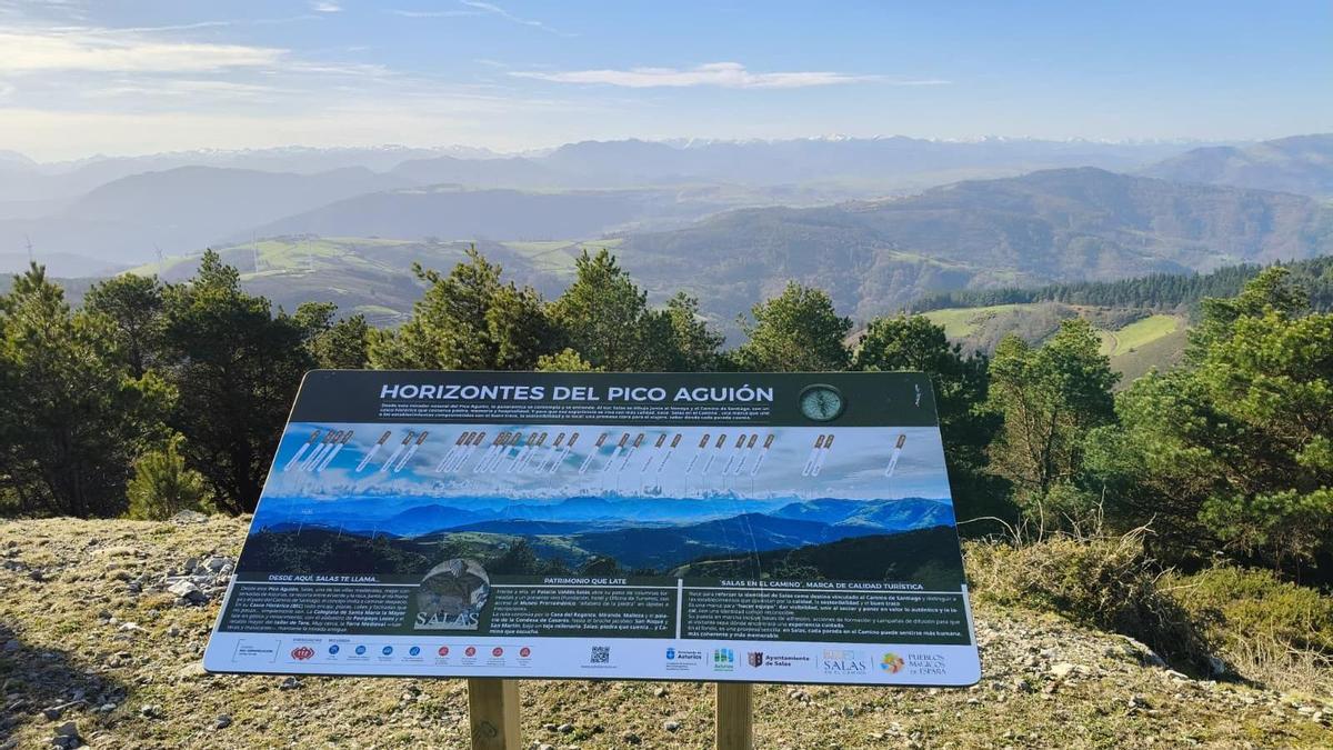«El paisaje también merece que te lo expliquen». Así comunicó la concejalía de Turismo de Salas la instalación de tres paneles informativos en el pico Aguión, el techo del concejo que se alza a casi 1.000 metros de altura (921 metros, concretamente). La cima, que supone el final de una ruta de más de 9,6 kilómetros, brinda a los visitantes unas espectaculares vistas que ahora se entienden mejor gracias a tres paneles informativos que señalan cada punto de interés en el mapa.