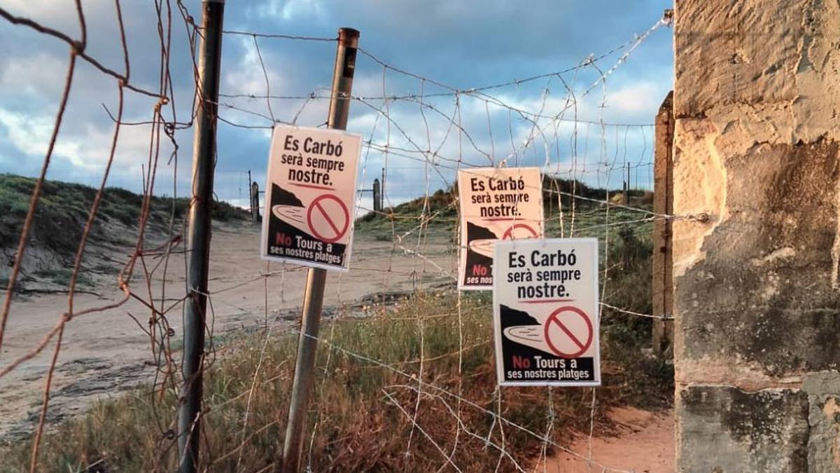 “Es Carbó serà sempre nostre. No Tours a ses nostres platges”, se podía leer en los letreros en los que también aparece un dibujo de una playa y una señal de prohibido.