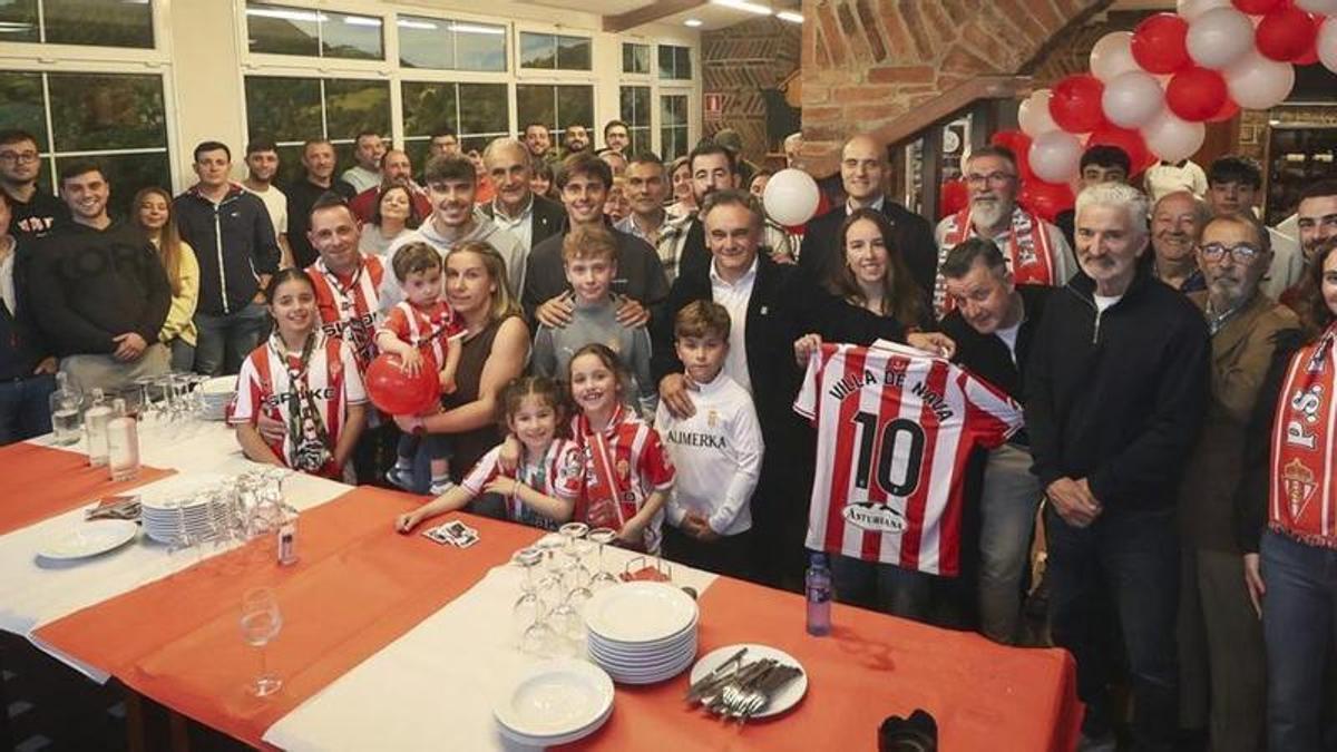 La peña sportinguista Villa de Nava festejó ayer el décimo aniversario de su fundación junto a una amplia representación del Sporting. El presidente de este colectivo, Álvaro García Huerta, recibió a David Guerra, vicepresidente ejecutivo, Joaquín Alonso, relaciones institucionales, y a los canteranos Gaspar Campos y Pablo García, momento que se recoge junto a estas líneas. El acto tuvo lugar en el restaurante Casa Mino y contó también con la presencia de José Antonio Redondo, leyenda rojiblanca muy vinculada a las peñas, entre otras personalidades.